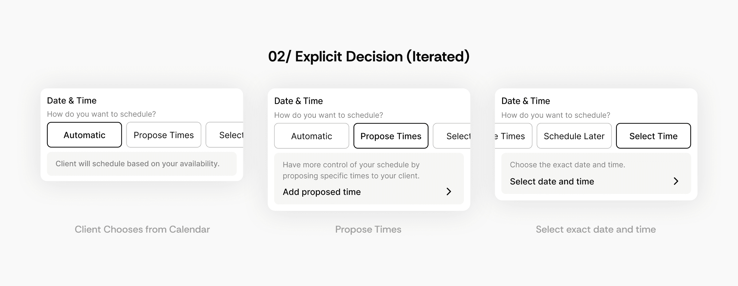 To simplify the experience for both the client and artist, we introduced a third option where the artist could select a single date and time. This approach led us to adopt the 'explicit decision' option, as it was more scalable and could be applied to cases with more than two options.