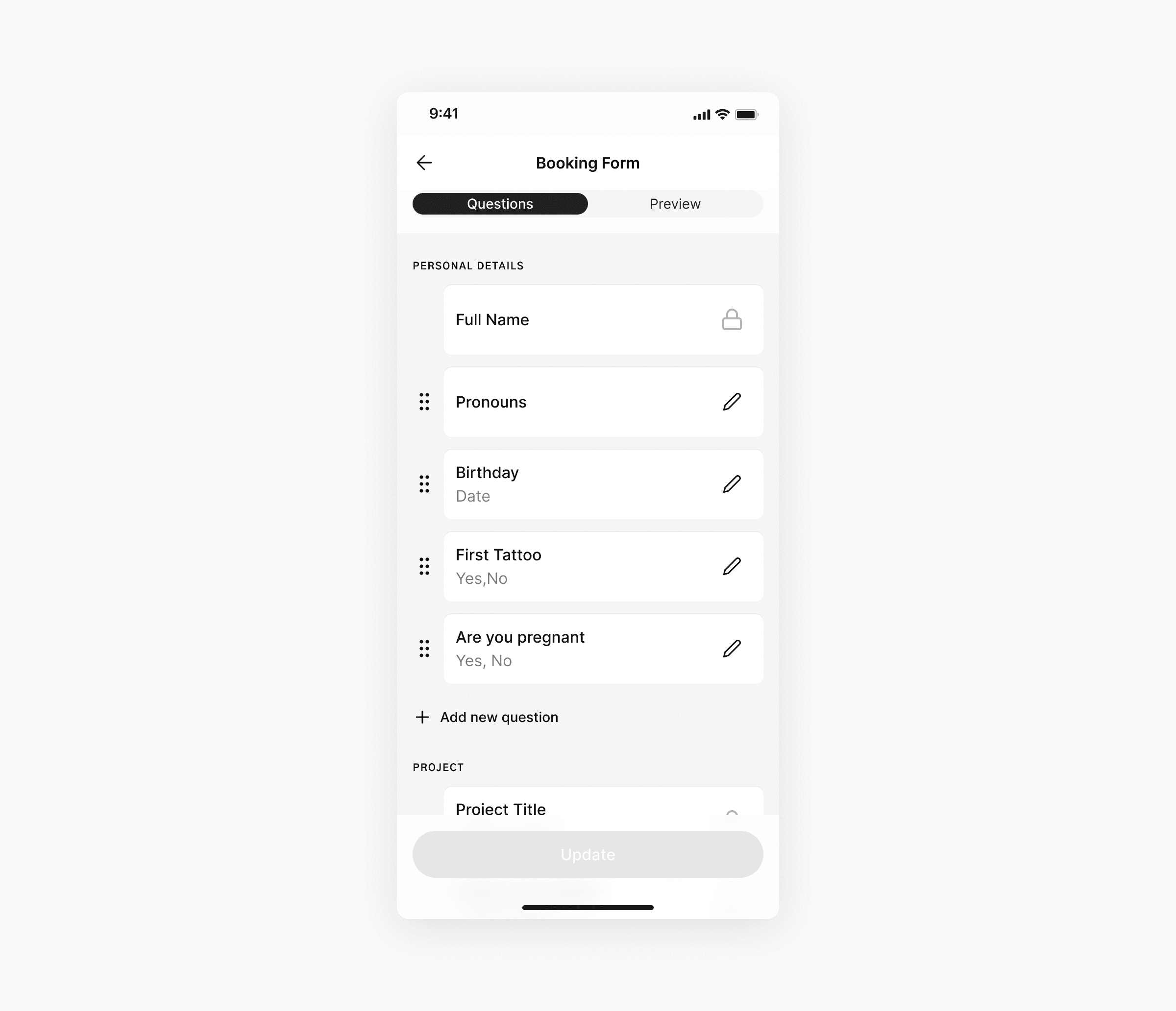 We discovered during our research that artists generally have similar questions that they include in their inquiry form. With Inkflow, clients will be able to create a customizable booking form fit to their needs. We decided to provide them with template questions to save time in creating their booking form.