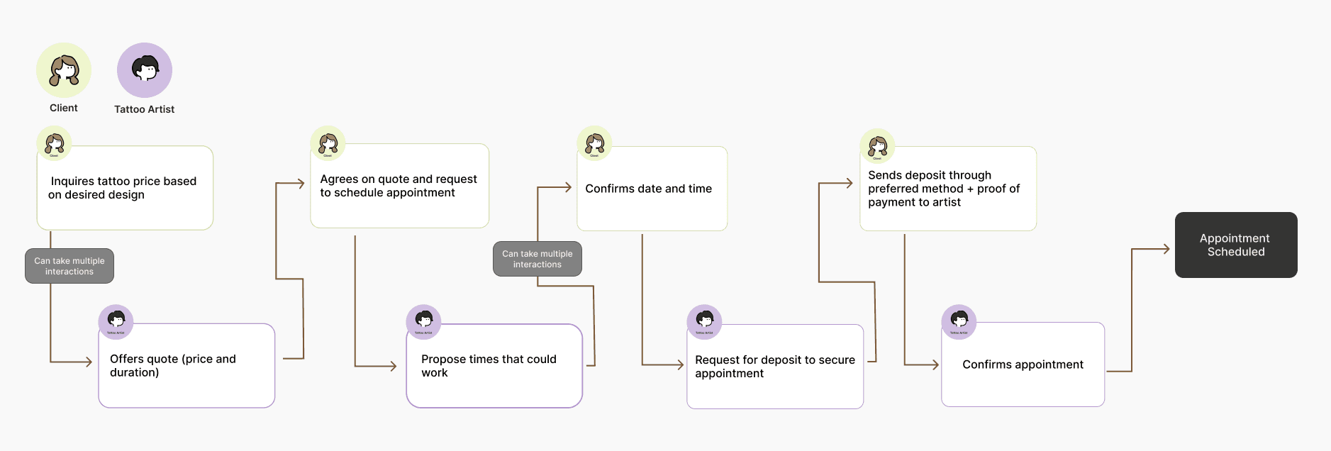 Many of the back and forth interaction happens when client is inquiring for a tattoo and when they are coordinating an appointment time.