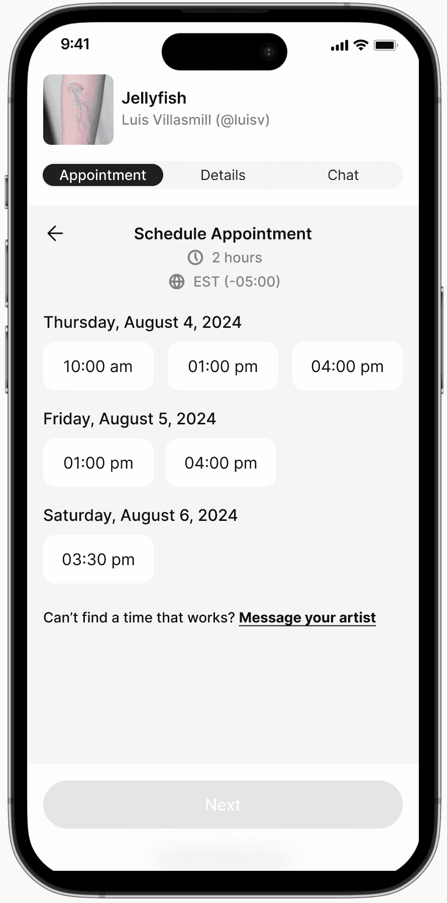 Client will see a time slot view of all the date and times that artist has proposed. If the options provided does not work, client will be able to message the artist and ask for more times. This view uses the same pattern as when client chooses from the calendar with the monthly view removed.