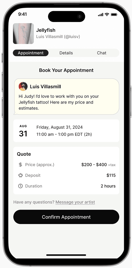 Clients will view the quote sent from the artist and will be able to schedule an appointment with the artist right away. To secure the appointment, client will need to pay for a deposit -- streamlining the deposit payment process.